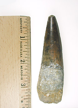 This is a gorgeous, larger tooth from a carnivorous dinosaur called Spinosaurus sp. This bad boy was the sail-backed villain in the last Juraissic Park movie. He was big and his teeth got big. Some say he could get to be 40-feet long, or more. (I don't think he could really beat a T-Rex, though, like was portrayed in the movie.) Wait until you wrap your fist around this beauty. It seems to be close to 2/3 of the length is enamel, a definite plus. See the photos on the right. This will be a jewel in anyone's collection! My source says it is from