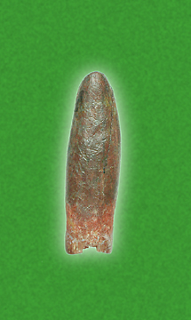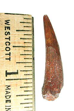 This is a gorgeous, larger tooth from a carnivorous dinosaur called Spinosaurus sp. This bad boy was the sail-backed villain in the last Juraissic Park movie. He was big and his teeth got big. Some say he could get to be 40-feet long, or more. (I don't think he could really beat a T-Rex, though, like was portrayed in the movie.) Wait until you wrap your fist around this beauty. It seems to be close to 2/3 of the length is enamel, a definite plus. See the photos on the right. This will be a jewel in anyone's collection! My source says it is from